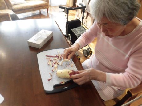さつま芋を切って、茹でてなどの工程を伝えながらも何が出来るの?と不思議そうにされていましたが、このまま食べたいねとの声も聞かれる事も♪