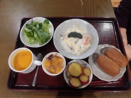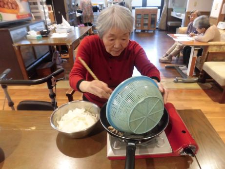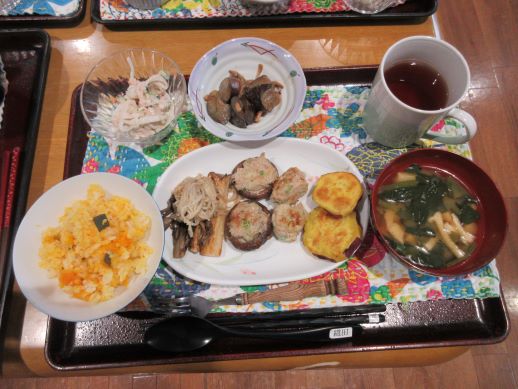 椎茸の肉詰め、きのこのバターソテー、かぼちゃごはんなど色々な秋の食材を料理しました。椎茸に詰める肉だねを力強く混ぜていただき、石づきを取った椎茸に詰めてホットプレートで焼きました♪えのき、エリンギなどのきのこも手で割いてバターでソテーしました。お肉もふっくら焼き上がりとても美味しく秋を味わいました☆