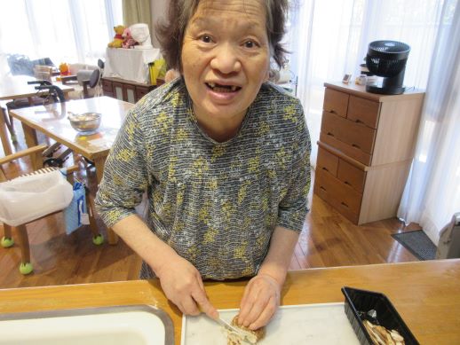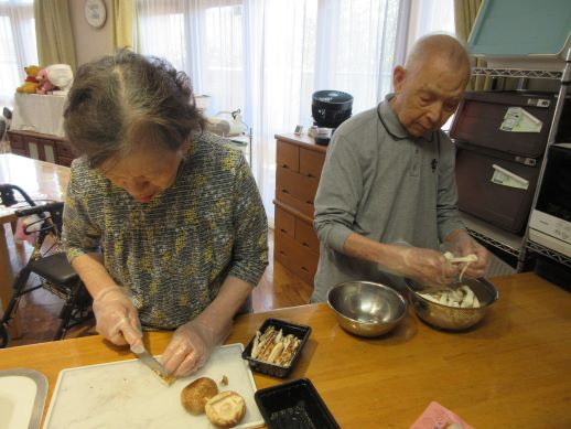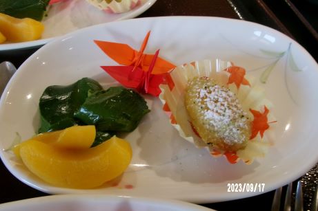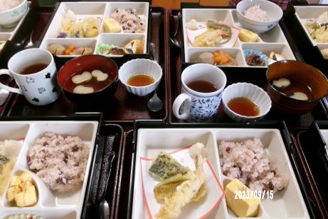 栗ごはん、秋鮭とキノコのソテー、なすのポン酢和え、柿のサラダ、豚汁、りんごのコンポート、と秋の食材をふんだんに使い、敬老のお祝いご膳の出来上がりです♪