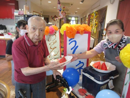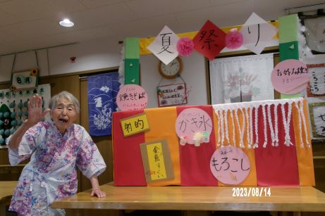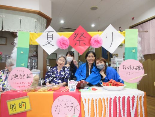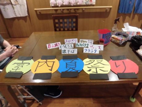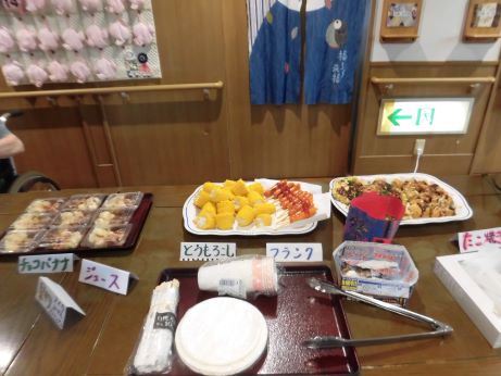 おでん、やきそば、たこやき、かき氷、ラムネ、わたあめ、すいか、とたくさんのメニューを用意しました。食券を使いそれぞれ好きな物を購入していただきます。