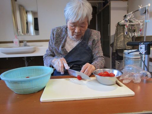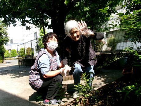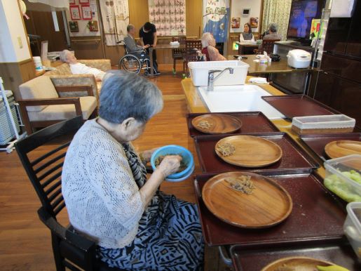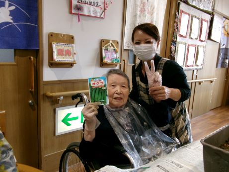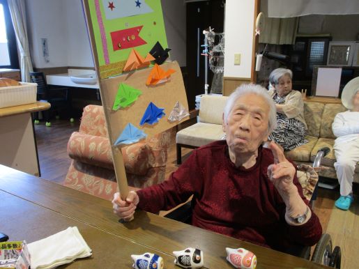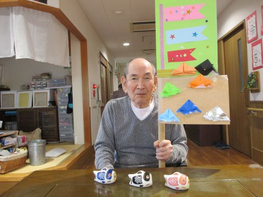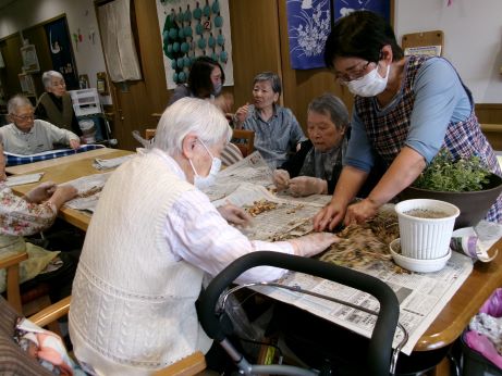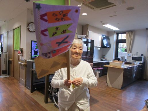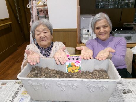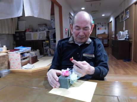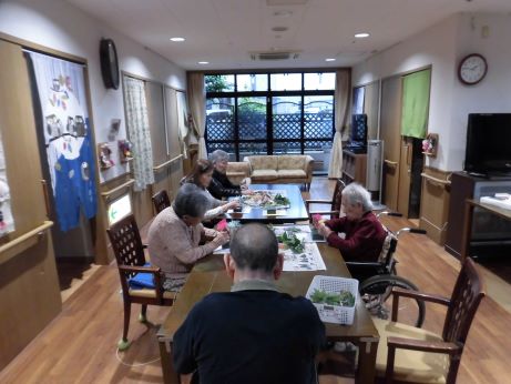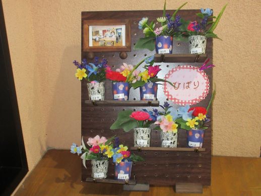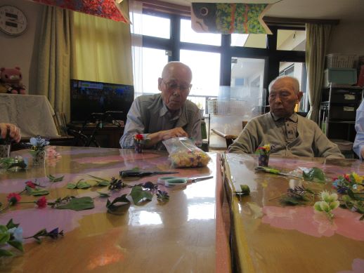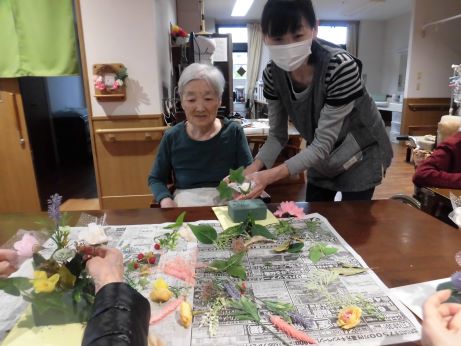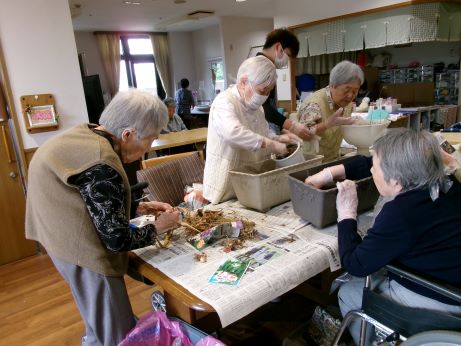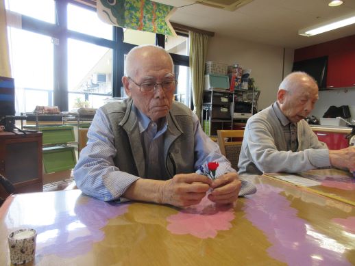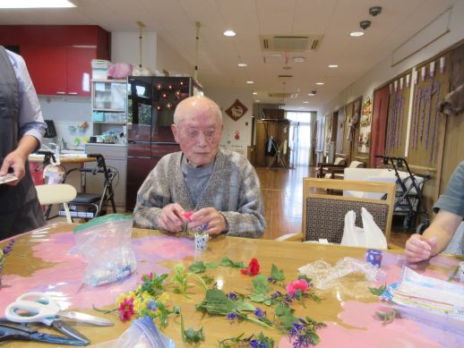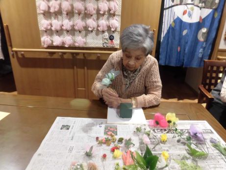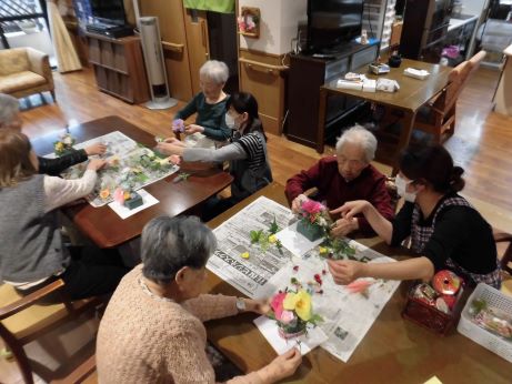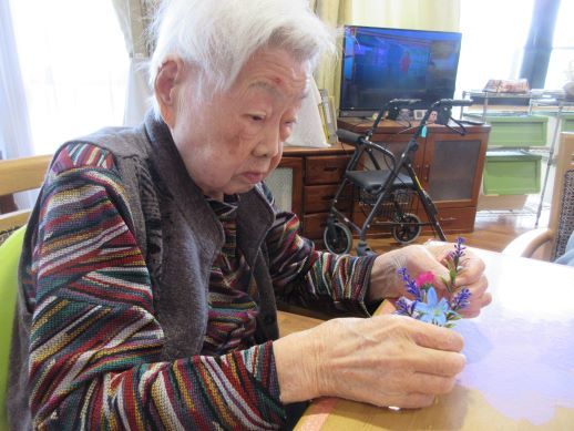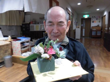 カップに紙粘土を詰めて好きなお花を挿しました♪「どのお花にしようかな」「バランスはどお?」「わあーかわいい」などとお話しながら作りました♪とても素敵にかわいらしく出来上がり、グループホームの玄関に飾らせていただいています♪