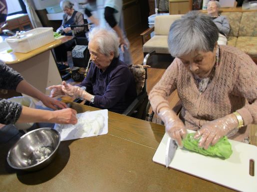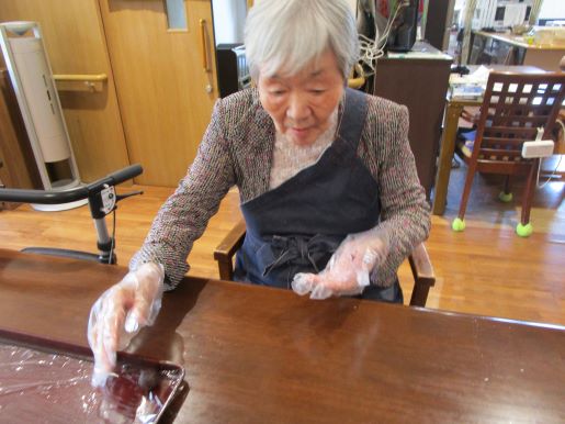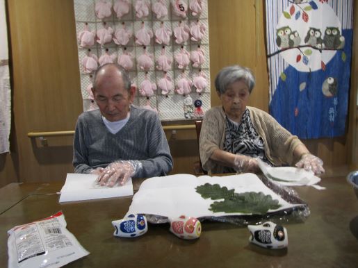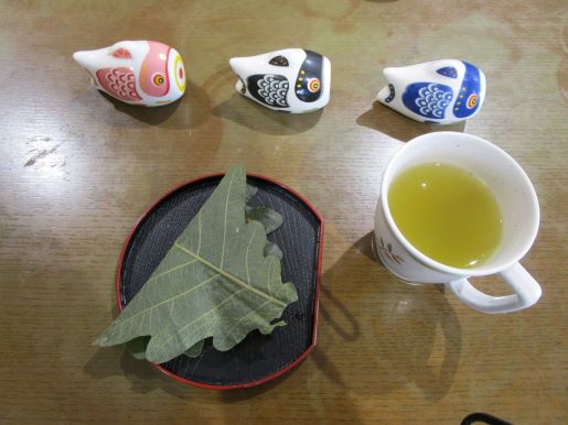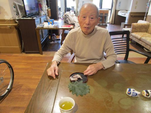 レンジから取り出し、生地を伸ばす工程が上手く出来ず最初は苦戦していましたが、1個2個と作っていくうちにコツを掴み、最後には綺麗に伸ばして餡子を入れて完成した柏餅をおやつに濃いお茶と一緒に召し上がりました♪