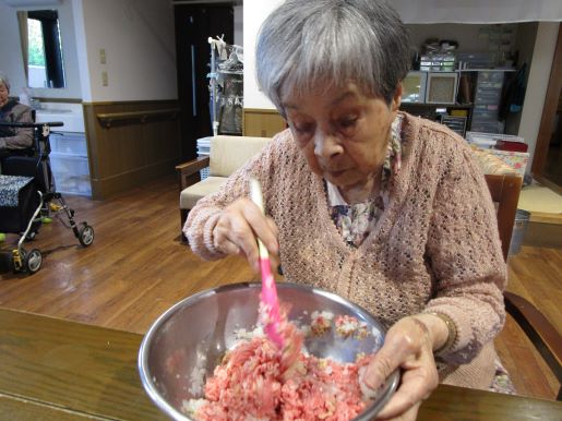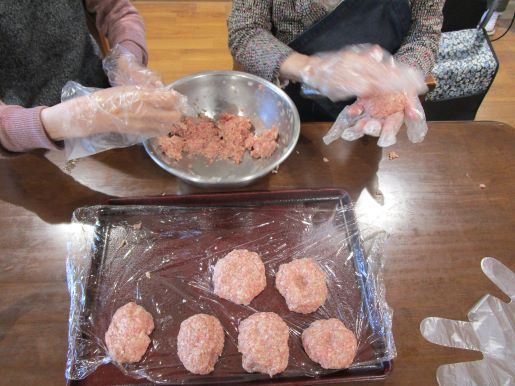 玉ねぎをみじん切にして、挽肉と混ぜて味付けをして軽く形を整えてホットプレートで焼きました。やっぱり自分達で作る食事は楽しね♪と、和気あいあいとハンバーグを焼いていました!