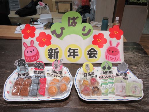 皆さんの出身地の中から秋田・山形・福島・岡山・群馬・広島県の銘菓をお取り寄せしておやつにいただきながら新年会を行いました。だるまの福笑いではユニークな顔に皆で大笑いし、地図を広げて自分の出身地を探したり、ご当地にまつわる〇×ゲームで一気に盛り上がりました。各地の銘菓を囲んで美味しくて楽しい時間でした☆