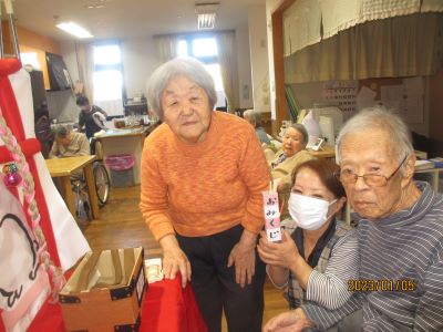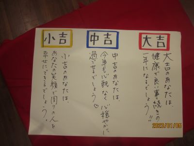 1人ずつ手を合わせてお願いごとをしてからおみくじを引いて「今年の運勢は?」と皆さんワクワク♪赤が大吉。青が中吉。黄色は小吉です。周囲の方々とくじを見せ合って「やった~!大吉!」「嬉しいね~!」と声をかけ合い、全員で年女の方に拍手をして笑顔いっぱい和やかな初詣でした☆