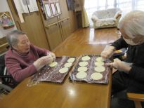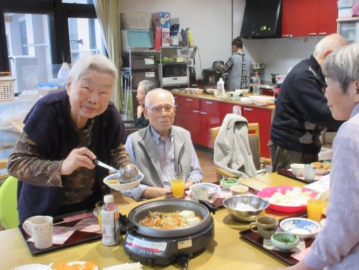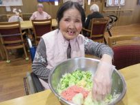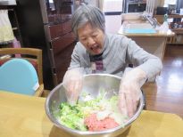 元気よく冬本番を乗り切ろう!と、ニンニク・生姜・ネギをたっぷり使って栄養満点の餃子と天津飯を作りました。包丁とフードプロセッサーを使いながら材料をカットして具材を混ぜ合わせてから皮に包んでホットプレートで焼いて、天津飯と中華スープも出来上がって「いただきま~す!」食べてはじめたら身体が温かくなってきて皆さん元気一杯♪