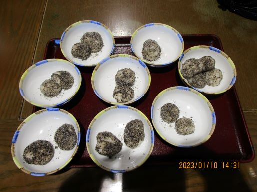 白玉団子、おしるこを作る事にしました。白玉粉を丸めてもらう方、ゴマ、きな粉、餡子をまぶす方に分かれました。皆さん手際が良くあっという間に3種類の団子が完成。
