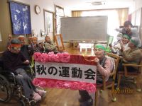 オレンジ、緑のハチマキを頭に巻き2チームに分かれての競技を行いました♪皆さんでラジオ体操をして体を動かし気合をいれ競技開始♪