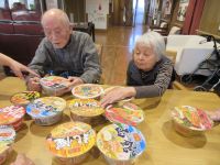 まずはたくさんの餃子を作りました。皆さんとっても上手に餃子を包んでくれ、ホットプレートできれいに焼きあがりました♪次はちまきです。クッキングペーパーにくるっと巻いて男性陣も頑張っています。最後にそれぞれ好きなラーメンを選びました!