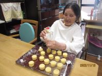 秋のスイーツといったらモンブラン!栗が美味しい季節ですよね♪カステラをま~るくくり抜いたりクラッシュした栗を生クリームと混ぜたり午前中からワイワイと準備をして午後トッピングをしました。クリームをうずまき状に絞るのが難しくて「あらー、はみ出しちゃったー!」と大笑いしましたが、栗たっぷり甘さひかえめで上品な味でした~☆
