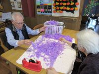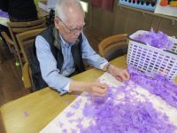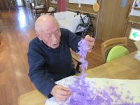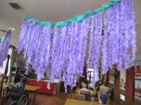 藤色のお花紙を長いテープに付けてたくさん作りました。みんなで作った藤の花を並べると、大輪の藤の花ができました♪ユニットに藤棚が出来たようでとてもきれいです☆