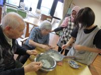 「へー、これが食べれるの?」なんて言いながらほんのり甘い生地に舌鼓♪黒みつときな粉皆さんの好きなあんこも載せて美味しくいただきました☆