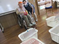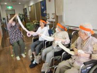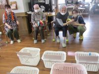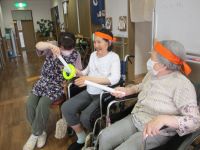 ピンク・オレンジチームに分かれて輪っかを使ったゲームをしました♪ラップの芯とタオルに輪っかを通して隣の人に送っていくゲームです。最初はうまくいかなくて苦戦しましたが皆で声をかけ合って手を上げたり下げたり工夫をしながら何とかクリア!最後は皆さん得意の輪投げで盛り上がって大歓声♪輪投げでピンクチームが逆転優勝しました☆
