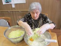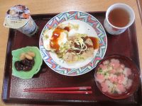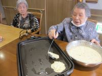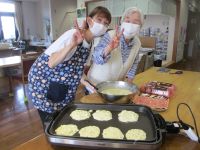 「今日お好み焼き作るの?楽しみ~」と、朝から全員で準備をしました♪キャベツが多くて生地に混ぜきらないので巣もごり卵も焼いてみることにしました☆「それっ!それっ!」と言いながらひっくり返し「沢山作ると美味しいんだよね」なんて話しながら焼きあがりを待ちました♪お肉たっぷりふんわり焼けて美味しかったです♪また皆で作りたいですね♪