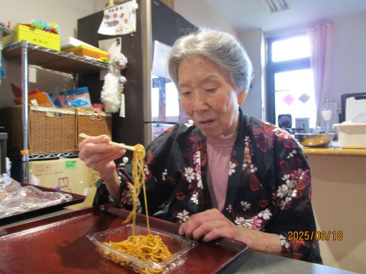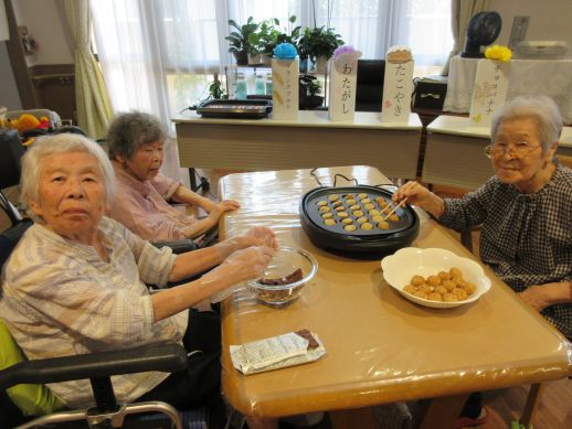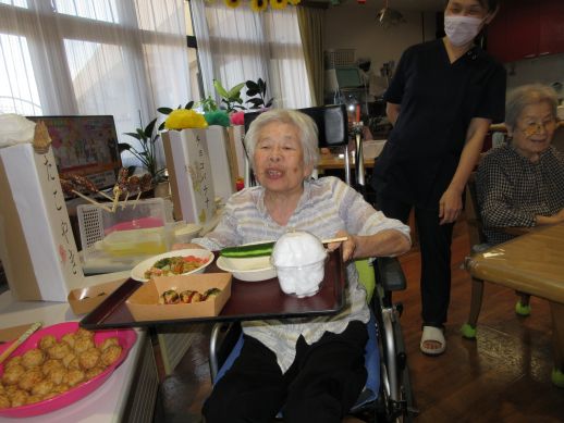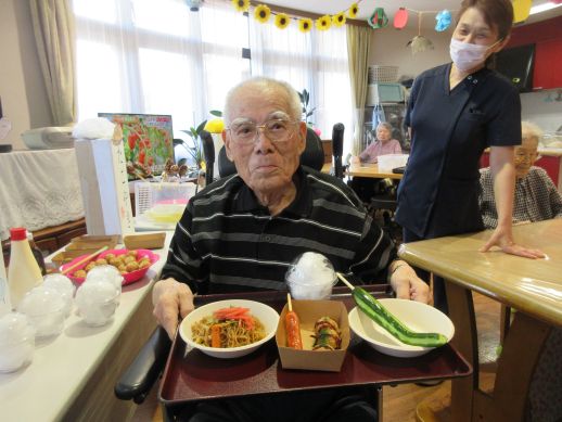 焼きそば、たこ焼き、フランクフルト、冷やしきゅうりなどを用意し皆で美味しく