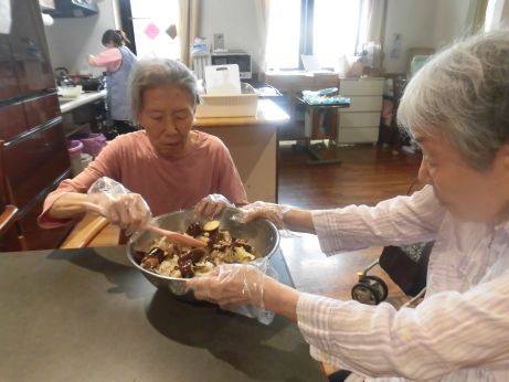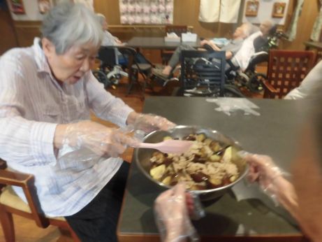 作る工程は何が出来るのかなぁと話しながら、野菜、肉等切って頂きながら、1品、2品と出来上がると、美味しそう早く食べたいねと声が上がっていました☆