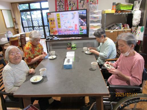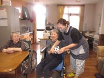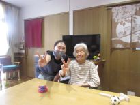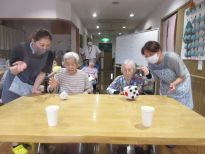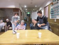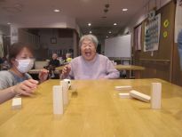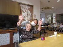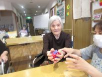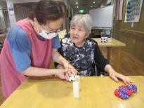 サイコロ転がし、ボール運び、ドミノ倒し、お手玉積みの順に場所を移動しながらゲームをしました♪一番盛り上がったのはサイコロ転がしで皆の気合いと迫力に圧倒されちゃいました♪個人戦で職員と闘った方は「若い者に負けてられないから頑張ったよ!」とガッツポーズ!全員でたくさん遊びました☆