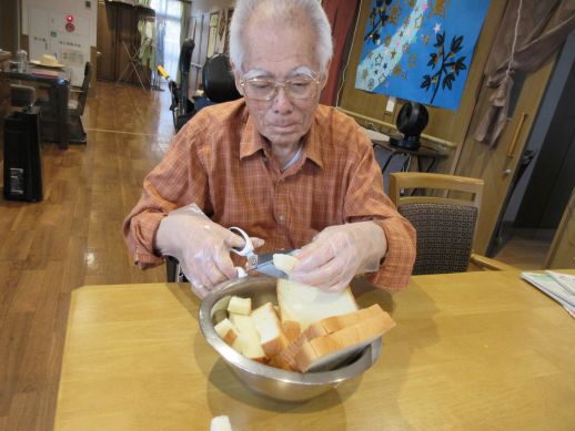 食パンをチョキチョキ、牛乳、卵、練乳、お砂糖をミキサ-にかけ裏ごしをして蒸し器へ!