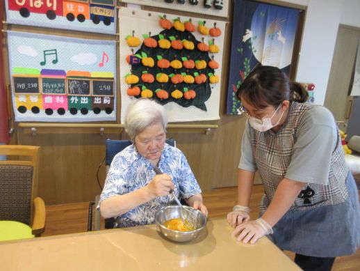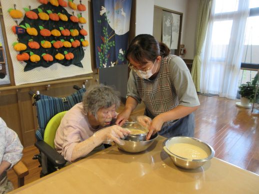 皆さんで蒸しパンを作りました。ゴマ入りと甘納豆入り2種類