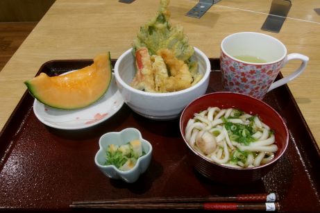 今日は天丼作りに挑戦しました~♪爽やかなシソの香りに季節を感じながら下ごしらえをしたり、美味しそうな茄子だね!なんて話しながら沢山揚げました。そして、小うどんと酢の物やメロンも添えて出来上がり~☆サクサクの天ぷらと甘口のタレが美味しくてご飯が進んじゃいました。また食べたいですね♪