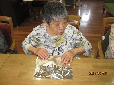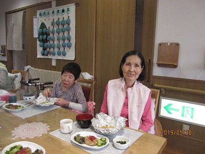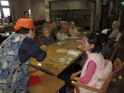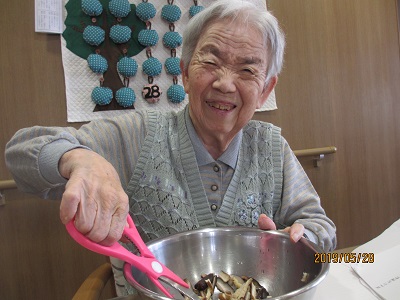 もち米を使って『ちまき作り』の始まりです♪味付けした具とご飯に火を通して皆様ウズラの卵を真ん中入れて包みました☆さてさて炊飯器に入れて炊き終わるのを待っている間、ちまきって歌にありましたよね♪“ちまき食べ食ーべ…”と「せいくらべ」の歌でした。ふっくら炊き立ての中華ちまきは味が染みていて、美味しかった!と大盛況でした☆